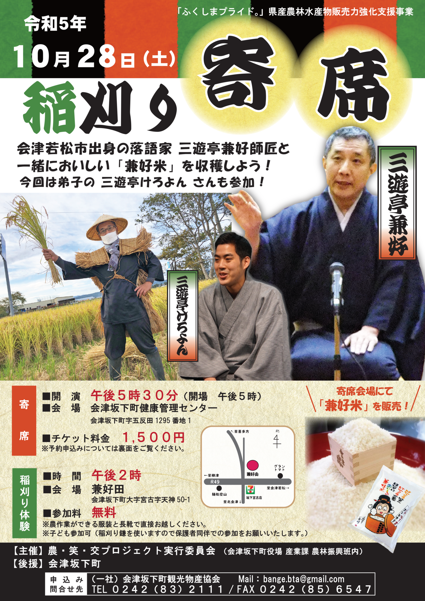 三遊亭兼好師匠と一緒に稲刈りを体験し一緒に汗を流しましょう。