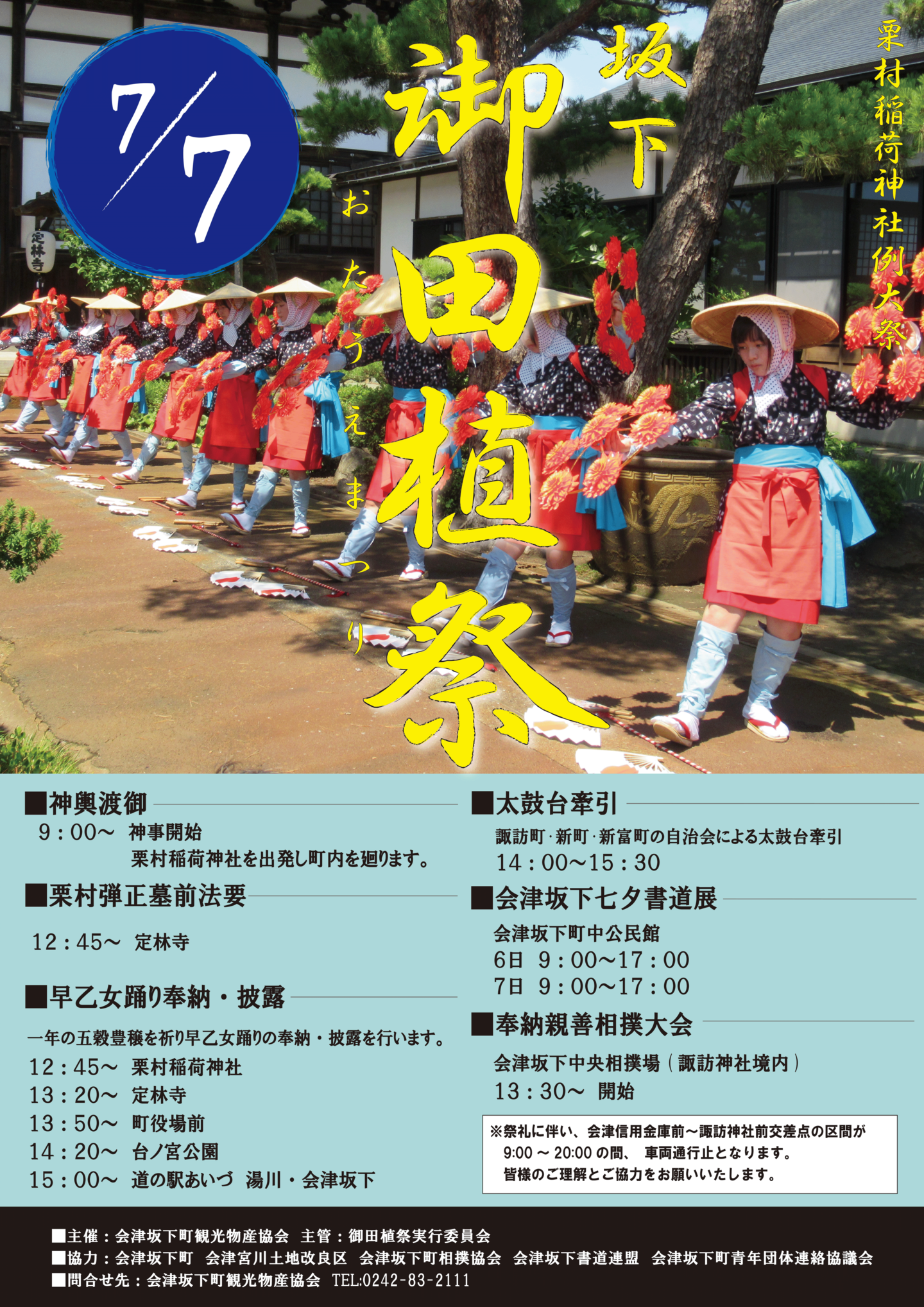 早乙女踊りの奉納・披露、太鼓台の巡行、親善奉納相撲大会、七夕書道展や露店の出店もあります!