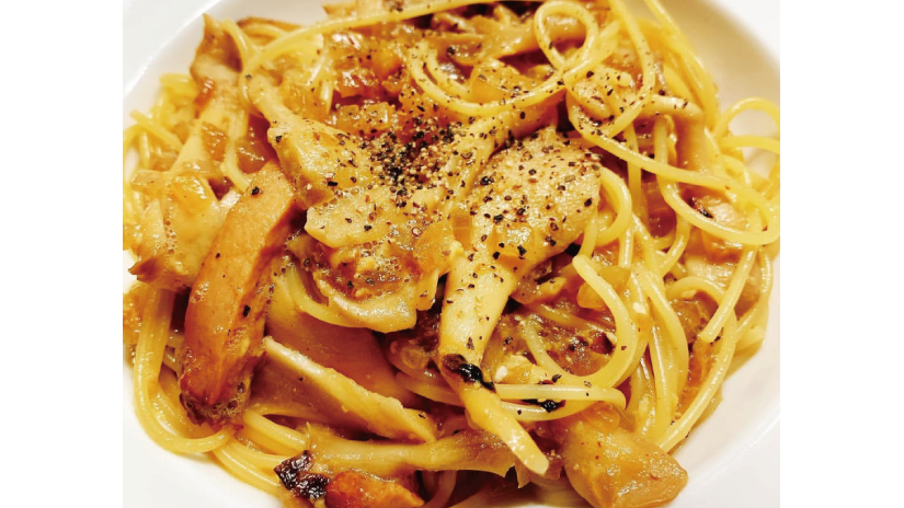 フライパンにバターを溶かし、玉ねぎ、ベーコン、しめじを炒める。具材に火が通ったら、茹で上がったパスタと茹で汁大さじ1を加えて軽く炒める。